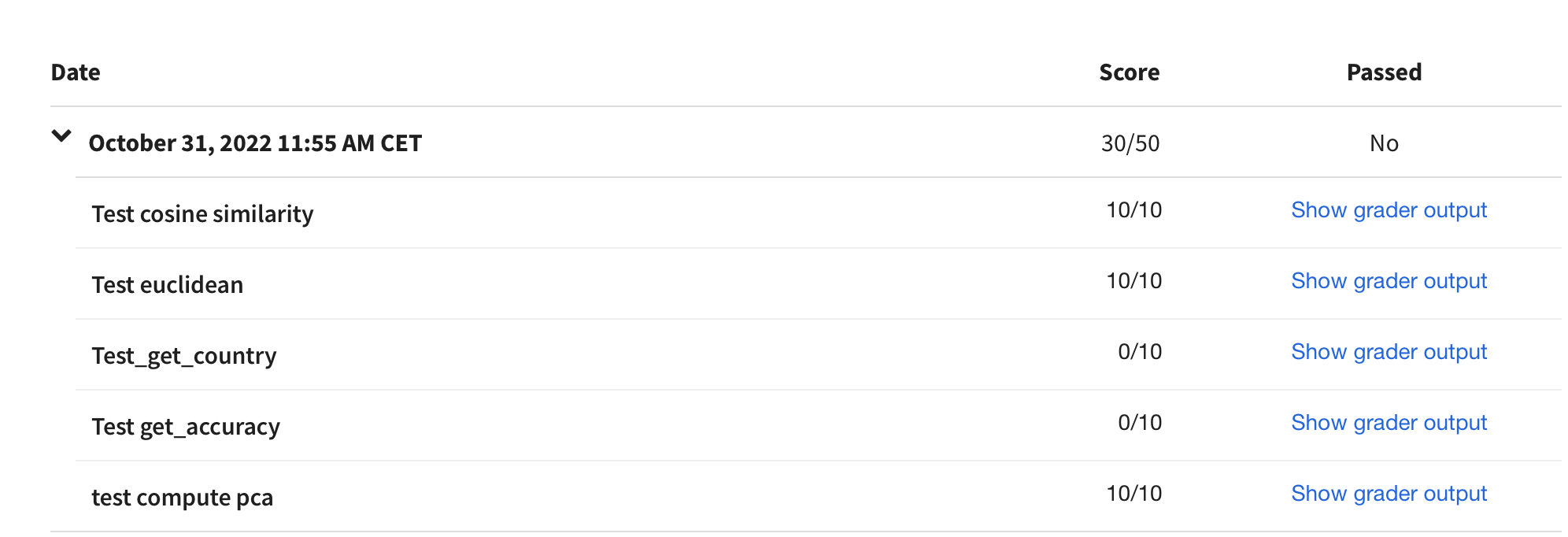 Upon checking, it appears that the parts of “Test_get_country” and “Test get_accuracy” did not receive passing marks. It is the same all the times.