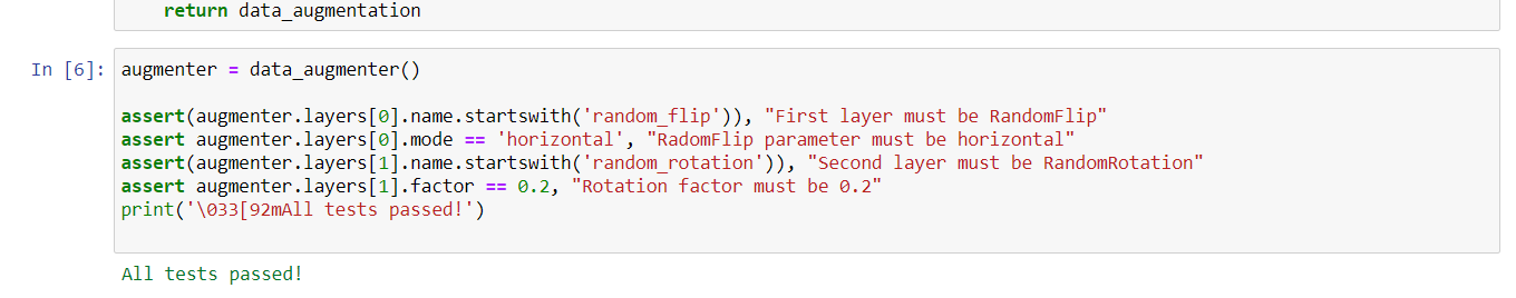 But the point is that prewritten cell calls a function that you wrote. That’s the point, right? So have you considered that maybe there is something wrong with your implementation of the data_augmenter function? There is a previous test cell that just tests that. Did that give you “All tests passed”?