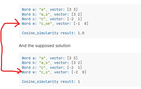There must be something different in how you wrote the code, because you picked a different “best analogy” for one of the word combinations. You picked another vector that points in the same direction, but is shorter. So how could that happen? There must be some subtle difference in your code. E.g. maybe you used >= instead of > for the comparison of the new value to the existing max?