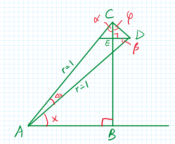 For the angle phi, if you look at my graph above, there are three unknown angles alpha, beta and phi, but you can also use them to write down three relations out of two triangles ΔABC and ΔACD and solve the angles in terms of x and Δx.