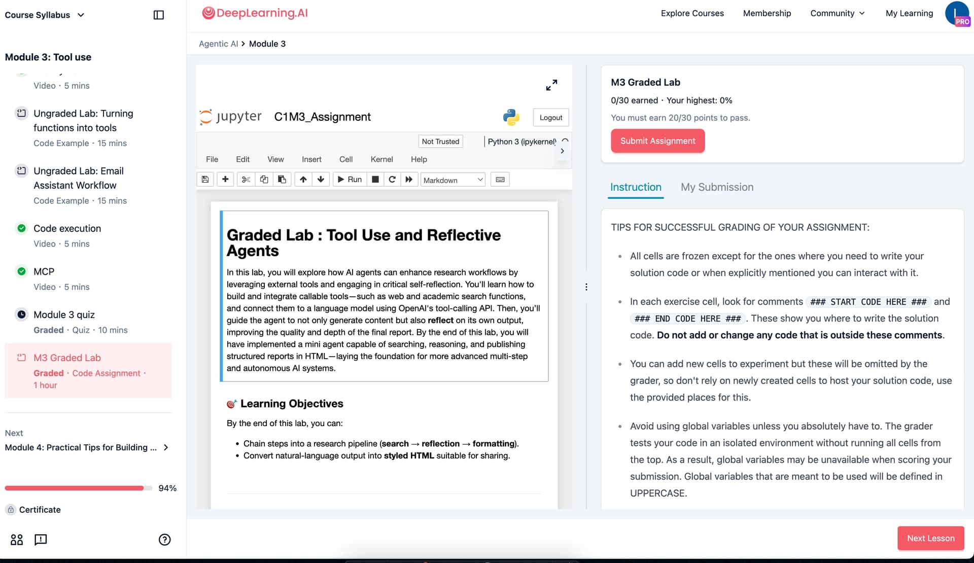 I get stuck with the “reload” button when I start M3 Graded Assignment from Agentic AI course