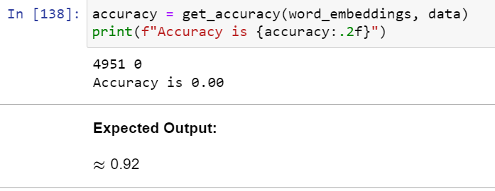 , you will find that it returns 2 things, the most likely country and it’s corresponding similarity score. In the get_accuracy