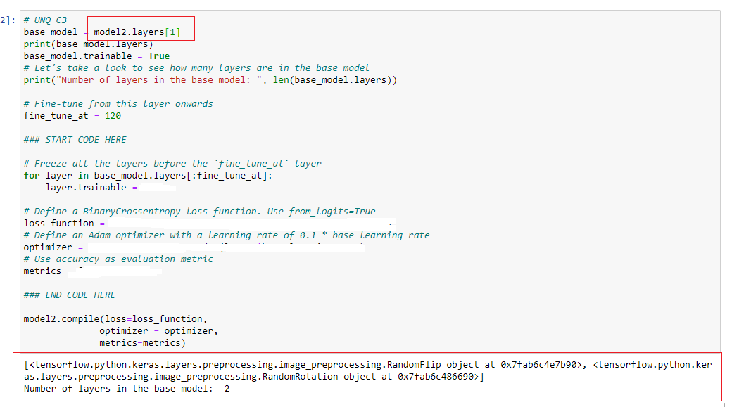 You can look back at the logic that you wrote to construct the alpaca_model and figure out what is happening. The “Sequential” layer that is index 1 on the list is the data augmentation output (a Sequential model with 2 layers). You can prove to yourself that the following two TensorFlowOp layers are created by the preprocess_input function by commenting that out in the alpaca_model logic and then printing the layers of the resultant model by commenting out the invocation of the comparator so that it doesn’t “throw”. So the reason that your original enumeration did not make sense is that it turns out that the function at index 2 returns two layers. That function is imported from Keras and here’s the docpage. You can see it scales the pixel values to be between -1 and 1, so it involves two steps: subtraction and then division.